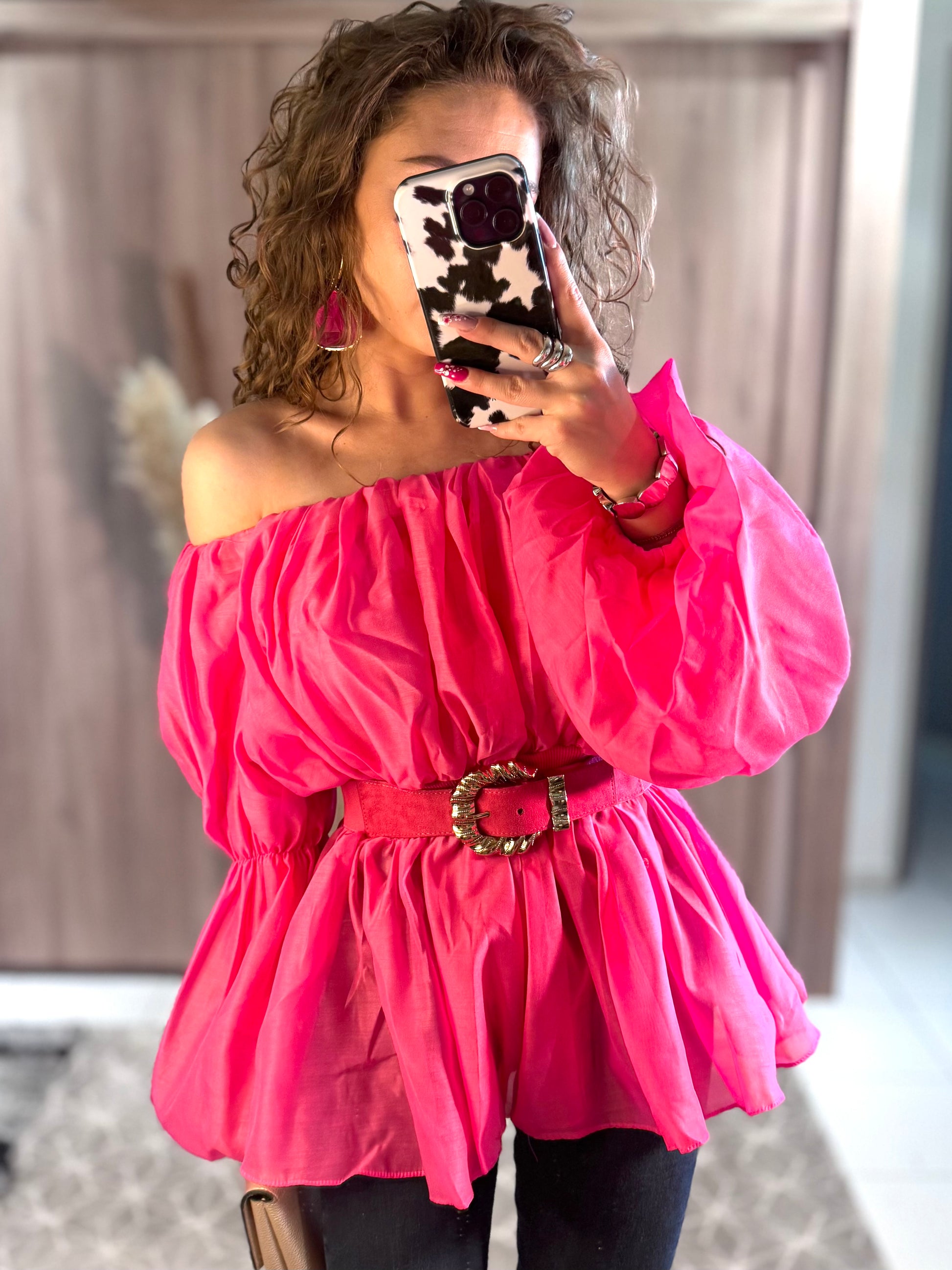 Ce bustier fuchsia ne passe pas inaperçu : sa coupe volumineuse sublime la silhouette, tandis que sa ceinture permet de marquer la taille avec élégance. Vibrant, audacieux, ultra-mode, il incarne à lui seul toute l’énergie d’un look assumé.