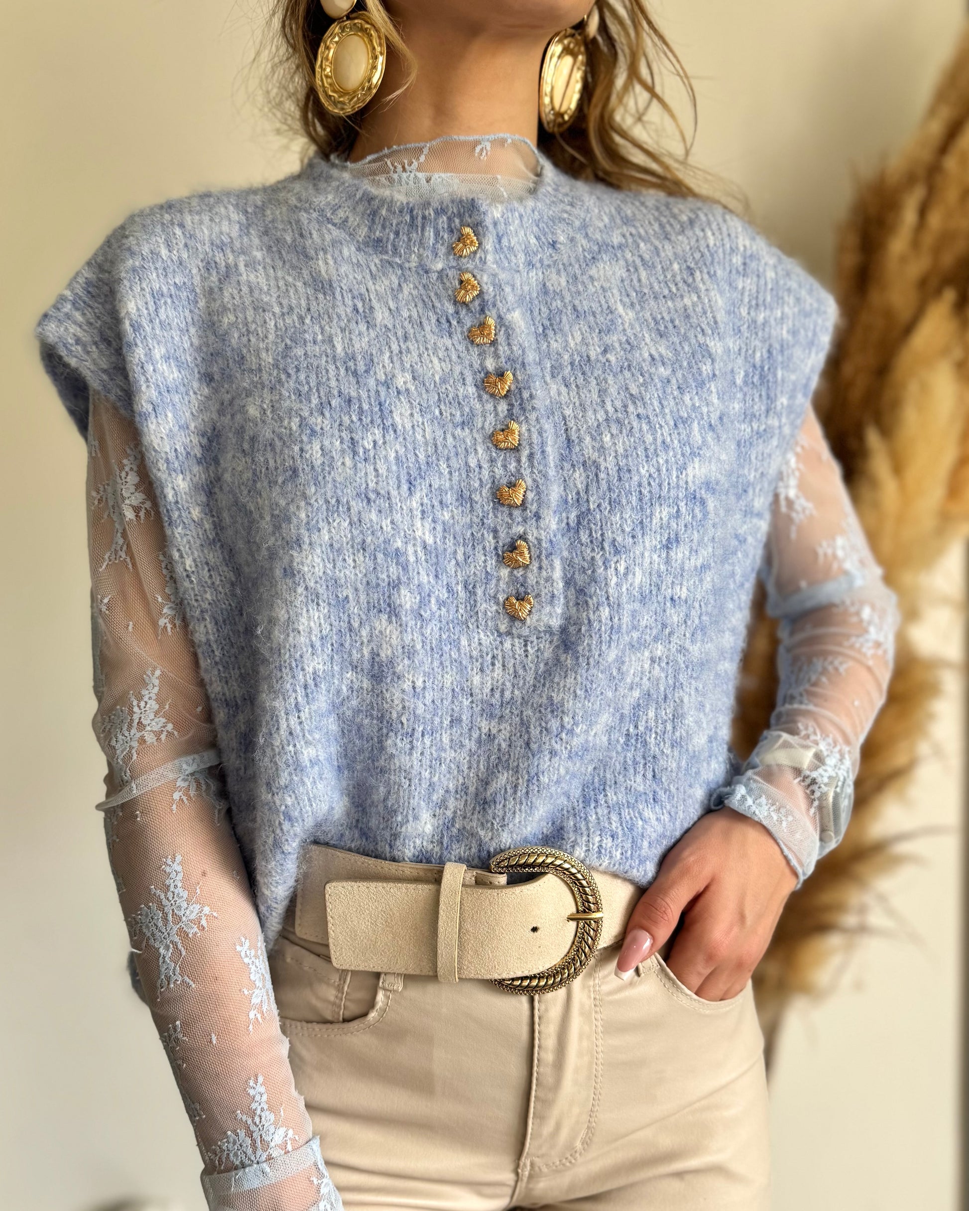 Son détail signature ? Son col modulable que l’on peut porter fermé façon col rond chic ou ouvert en V féminin, selon l’envie du jour. Les boutons en forme de cœurs dorés ajoutent une touche précieuse et romantique qui fait toute la différence.