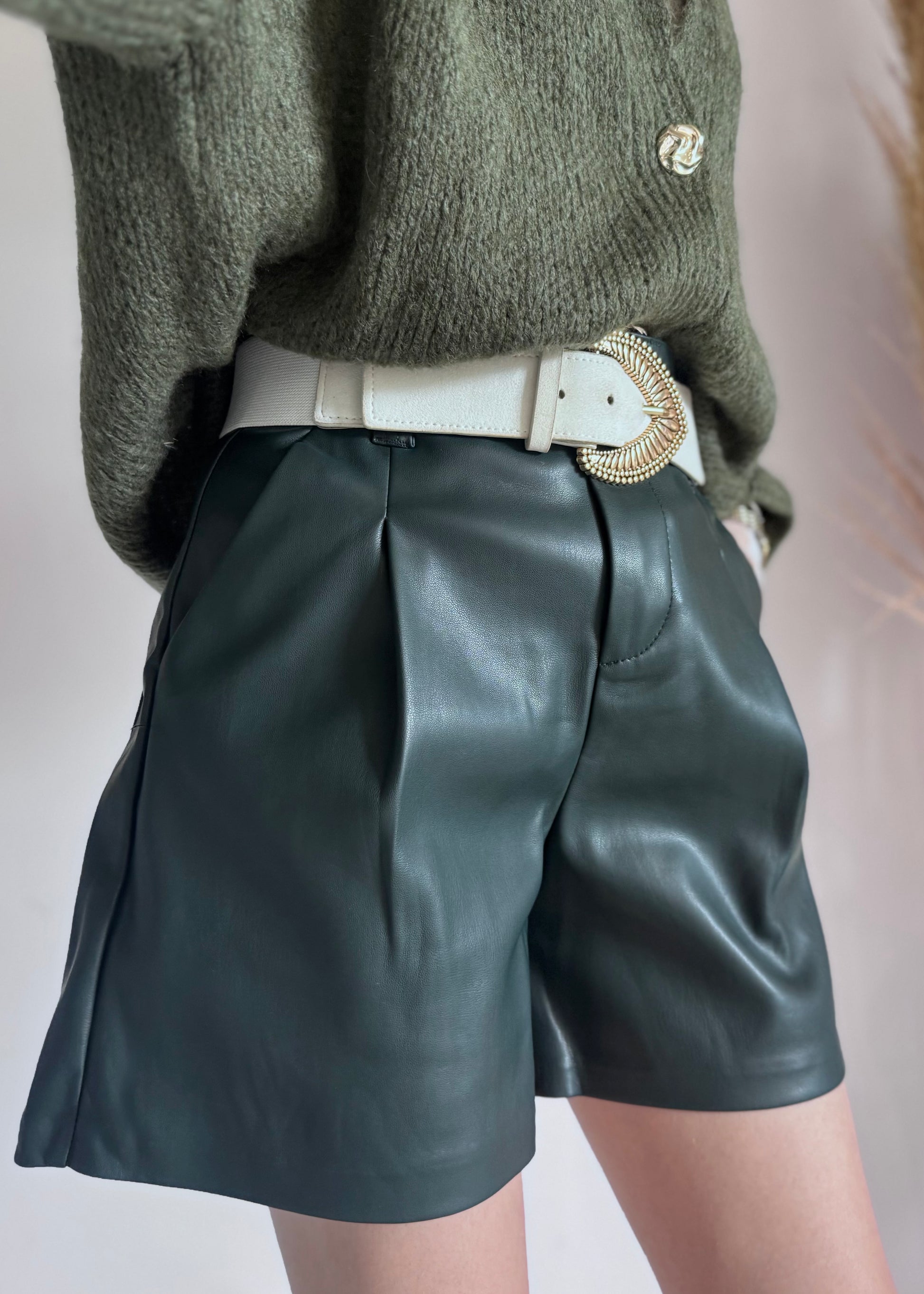 Ce short revisite lâĂ©lĂ©gance avec une touche moderne et audacieuse. ConfectionnĂ© en simili cuir vert sapin, il apporte une profondeur unique Ă la silhouette, parfaite pour se dĂ©marquer avec style. Sa coupe fĂ©minine et tendance lui permet de se porter aussi bien avec un pull douillet quâavec une blouse lĂ©gĂšre pour jouer les contrastes.