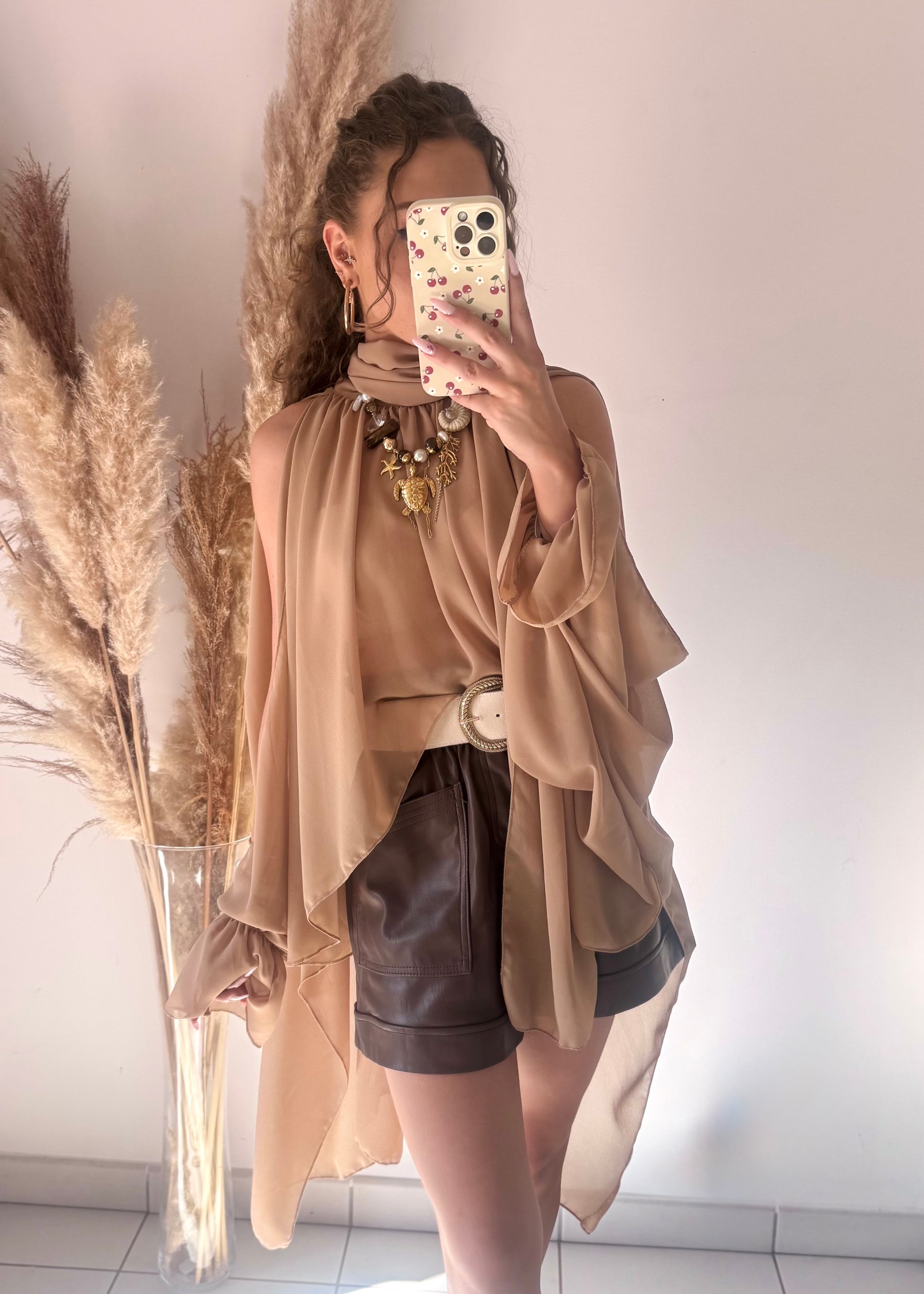 Avec sa coupe audacieusement asymétrique, CARMEN bouscule les codes du top classique. Son col montant élance la silhouette, tandis que ses manches longues fendues laissent subtilement apparaître les bras avant de se resserrer aux poignets pour un tombé chic. À l’arrière, un délicat nœud noué à la nuque dévoile un dos partiellement ouvert, pour un jeu de contrastes entre couverture et sensualité. Le tout dans une teinte camel chaude et élégante, parfaite en toute saison.