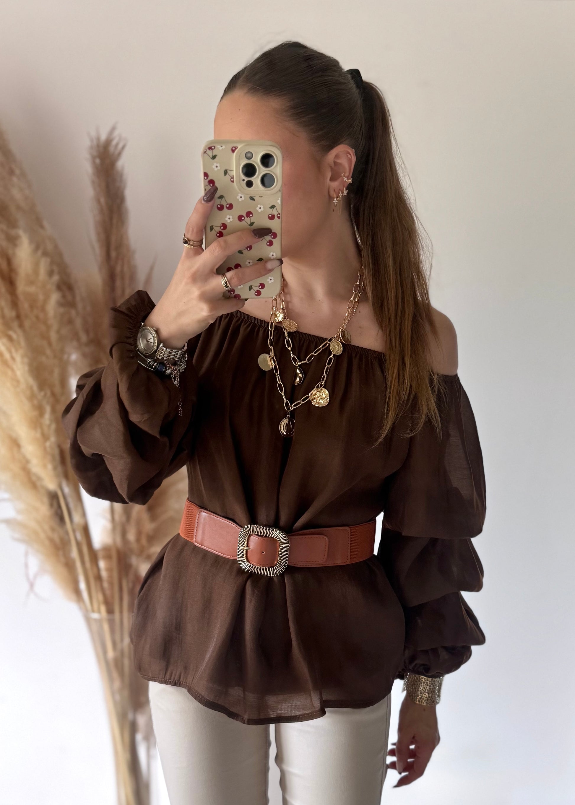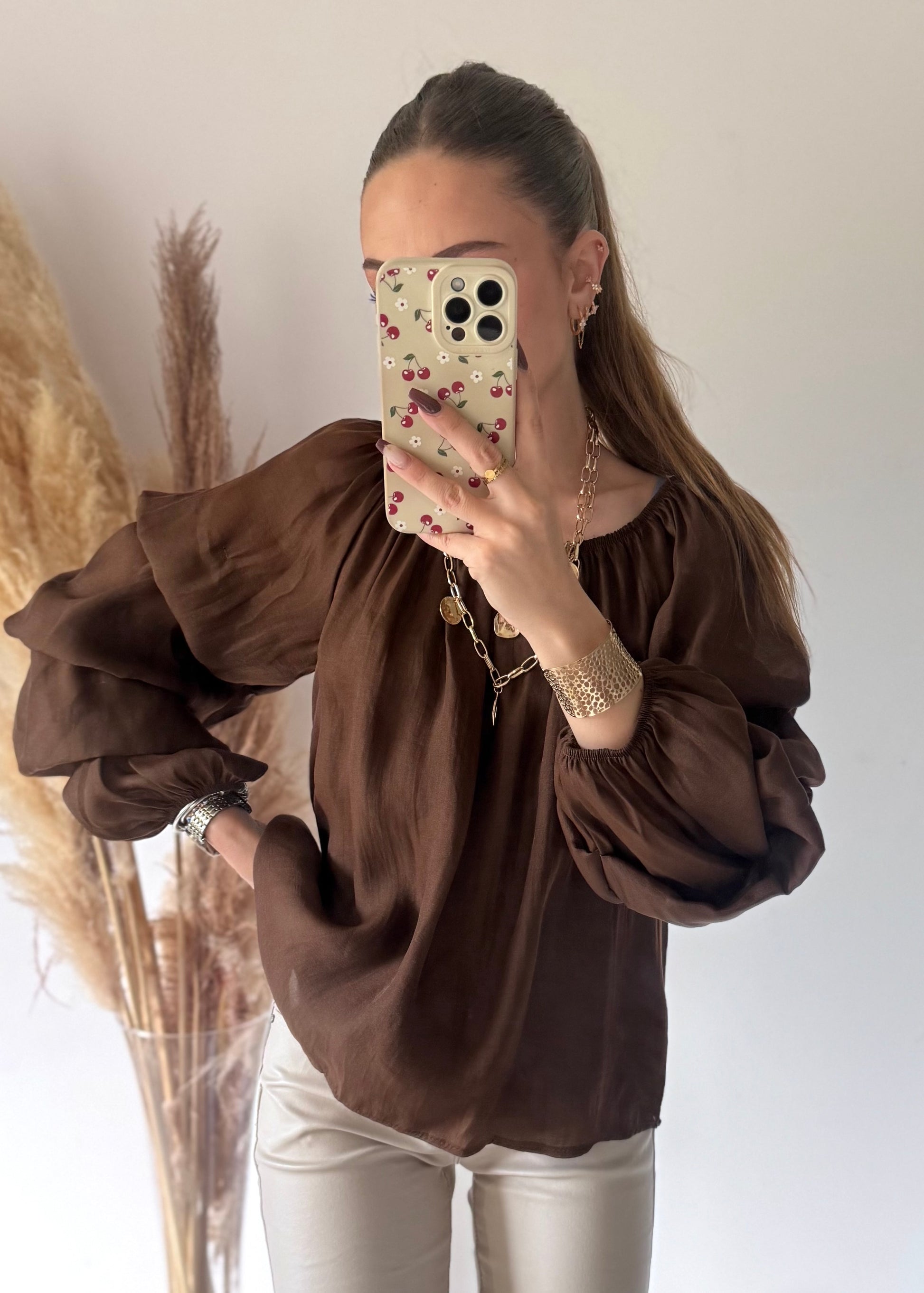 Une coupe fluide qui se distingue par ses manches bouffantes légèrement plissées, qui apportent du volume et une touche de raffinement. À la fois simple et sophistiqué, ce haut s’adapte à toutes les occasions, du quotidien à une soirée plus habillée.